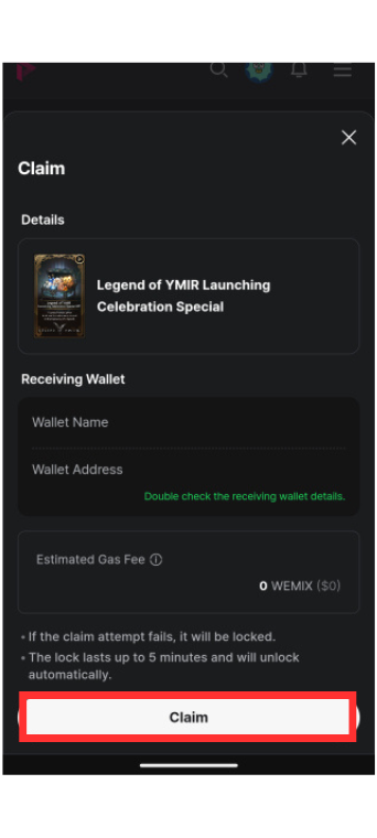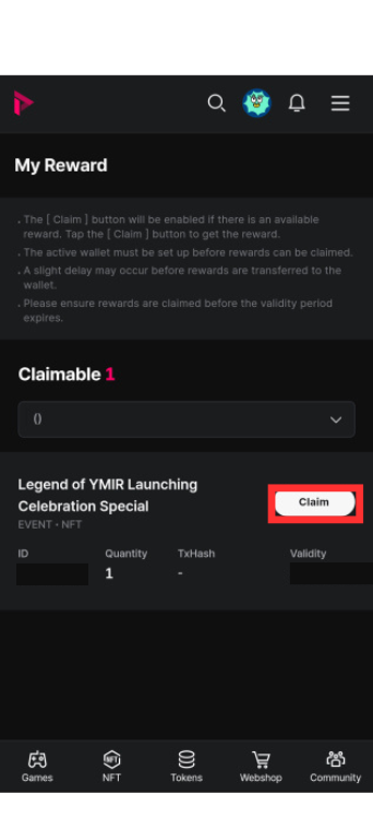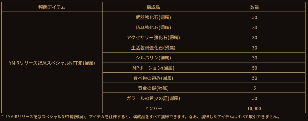 YMIRリリース記念スペシャルNFT箱は、ゲーム内で封印を解除していただくことで該当のアイテムを獲得できますとのことでした。
