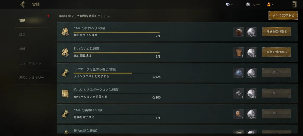 ある程度進めたら、「実績」から報酬をもらうのを忘れないようにしましょう。