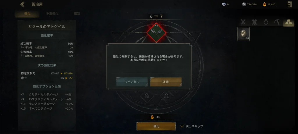 レベル6までは成功率100%で上げられますが、レベル7以降は装備が壊れる可能性が出てくるため注意が必要です。